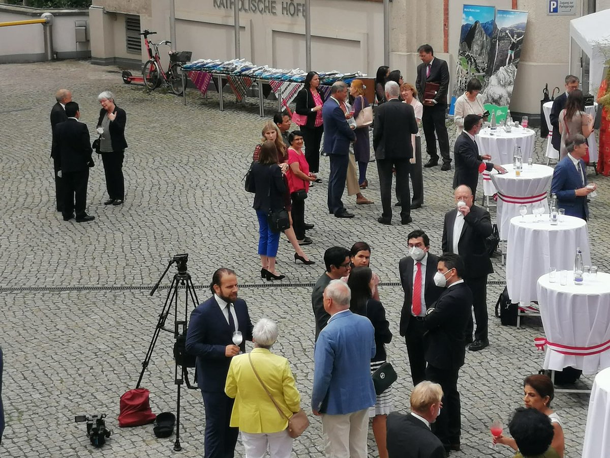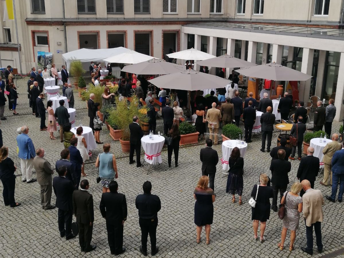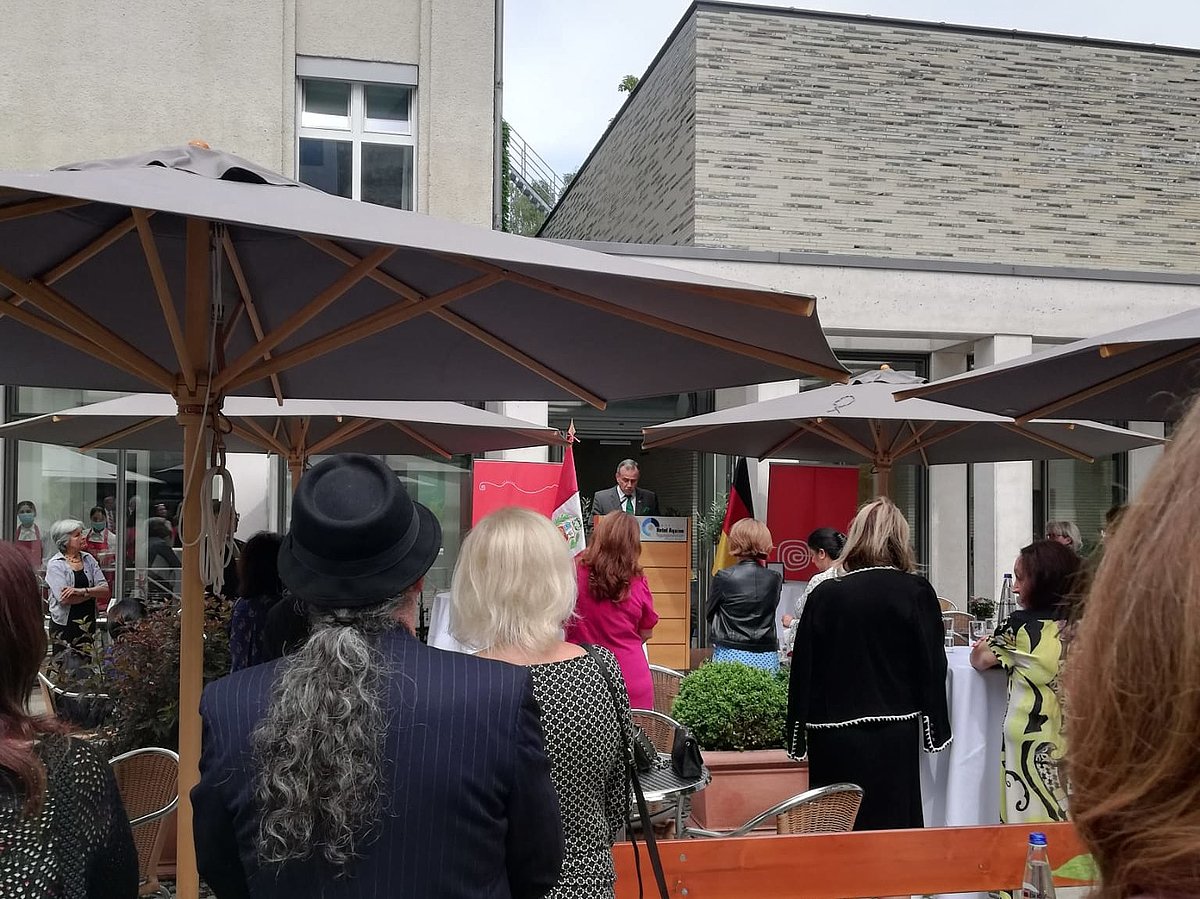 Die Republik Peru feierte am 28. Juli 2021 ihren 200. Unabhängigkeitstag, den „Bicentenario del Perú". Anlässlich dieses besonderen Datums lud die Botschaft Perus in Berlin ausgewählte Personen zu einem feierlichen Empfang unter freiem Himmel ein. Dr. Irma de Melo-Reiners, Geschäftsführerin von BAYLAT, folgte der persönlichen Einladung des Botschafters von Peru in Deutschland, S.E. Herr Elmer Schialer. Dieser hielt vor den rund 100 Gästen eine Rede. Außerdem richtete sich der Bundestagspolitiker und Leiter des Gesprächskreises Lateinamerika der CDU/CSU-Fraktion Peter Weiß mit Grußworten an die TeilnehmerInnen des Festakts.