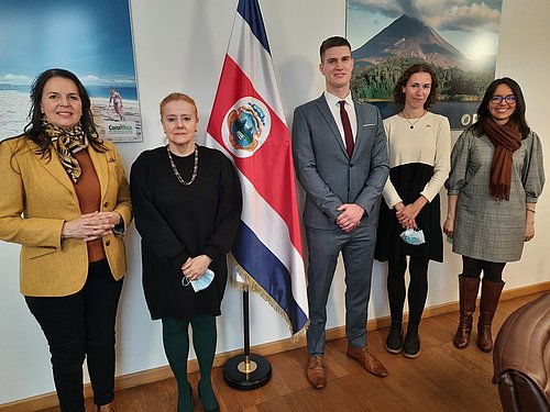 Der erste Termin führte die BAYLAT-MitarbeiterInnen am 2. November in die Botschaft von Costa Rica, wo sie sich mit der Botschafterin I.E. Lydia Peralta Cordero, der Gesandten-Botschaftsrätin und Generalkonsulin Eugenia Gutiérrez Ruíz und der Gesandten-Botschaftsrätin Marianela Álvarez Blanco besprachen. Themen des Arbeitstreffens waren unter anderem der Aufbau eines Netzwerkes costa-ricanischer WissenschaftlerInnen in Deutschland und eine von BAYLAT für 2022 geplante Delegationsreise nach Costa Rica.