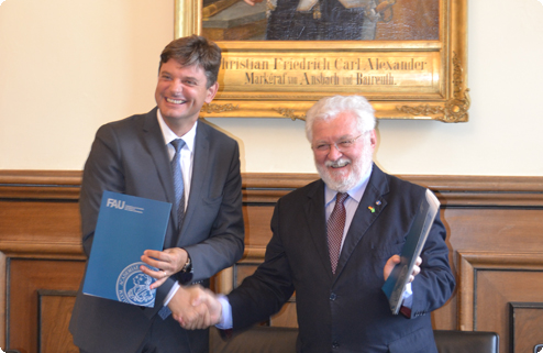 Highlight des Delegationsbesuches war ein Gesprächstermin mit Professor Dr. Joachim Hornegger, Präsident der FAU. In Anwesenheit von Professor Dr. Günter Leugering, Vizepräsident für Internationale Angelegenheiten der FAU, Dr. Brigitte Perlick, Leiterin des Referats für Internationale Angelegenheiten der FAU, Dr. Natalia Jörg, Referentin des Vizepräsidenten für Internationale Angelegenheiten sowie von Dipl.-Ing. Tobias Zobel, Dipl.-Pol. Luise Freitag und Marilia Wickert B.A. unterzeichnete die beiden Universitätspräsidenten ein Memorandum of Understanding, welches eine offizielle Partnerschaft zwischen UNISINOS und der FAU etablierte.