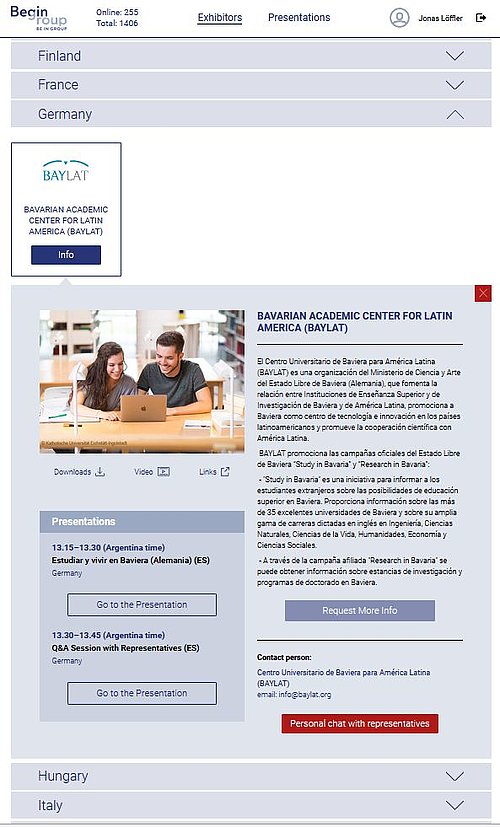 Bei der Online-Veranstaltung präsentierten sich neben BAYLAT 34 Hochschulen aus 19 Ländern den insgesamt 1.500 MessebesucherInnen. BAYLAT war als einzige Institution aus Deutschland mit einem virtuellen Stand vertreten. Hier informierten als Standkoordinator Jonas Löffler, BAYLAT-Referent und Marketingbeauftragter, und Sofía Royon, BAYLAT-Verwaltung, die Interessierten aus Südamerika über das gesamtbayerische Studien- und Forschungsangebot im Sinne der Informationskampagnen des Bayerischen Staatsministeriums für Wissenschaft und Kunst (StMWK) „Study in Bavaria“ und „Research in Bavaria“. In den Textchats kamen die entsprechenden Materialien aus diesen Kampagnen genauso zum Einsatz wie die von den bayerischen Hochschulen bereitgestellten digitalen Informationen und Direktlinks zu Studiengängen, die von den BAYLAT-MitarbeiterInnen passgenau als Antworten auf die zahlreichen Anfragen zusammen mit weiteren Erklärungen gesendet wurden. Zusätzlich waren Videos und Links von BAYLAT bzw. des StMWK zusammen mit digitalen Infobroschüren zum Download am Stand für die BesucherInnen hinterlegt.