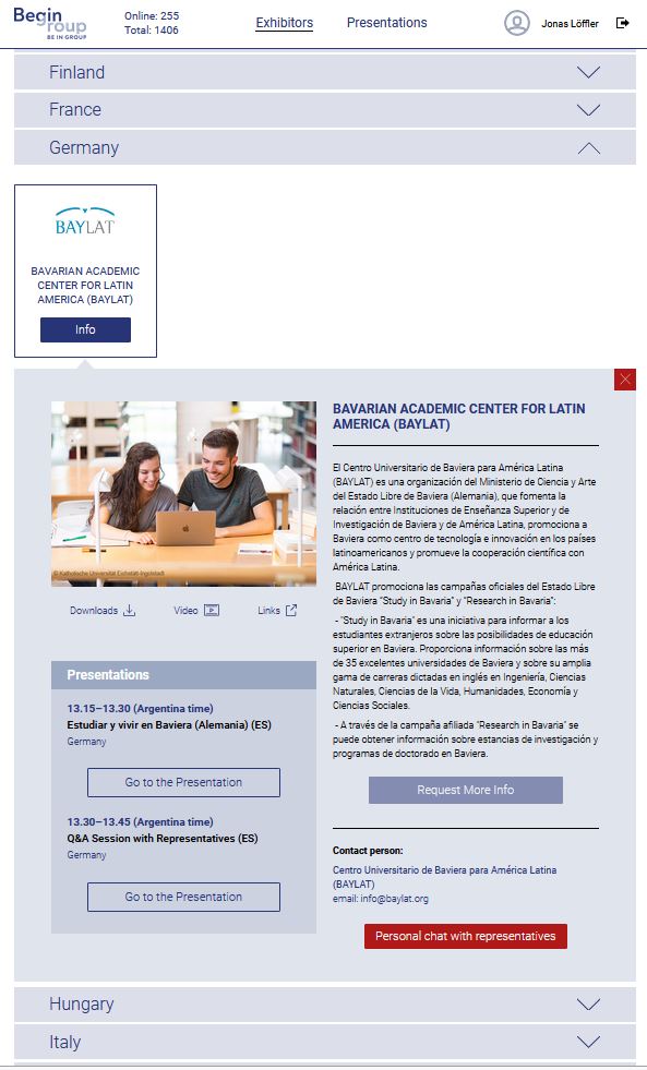 Am Samstag, den 13. November nahm BAYLAT erstmalig an einer von der Berliner Begin Group angebotenen virtuellen Messe teil. Die „Begin South America Online Edu Fair“ richtete sich an Studieninteressierte aus Südamerika, insbesondere aus den Ländern Argentinien, Chile, Ecuador, Kolumbien, Paraguay, Peru und Uruguay. BAYLAT konnte mit zahlreichen Chatanfragen und einem gut besuchten Live-Vortrag einen erfolgreichen Messeauftritt verzeichnen.