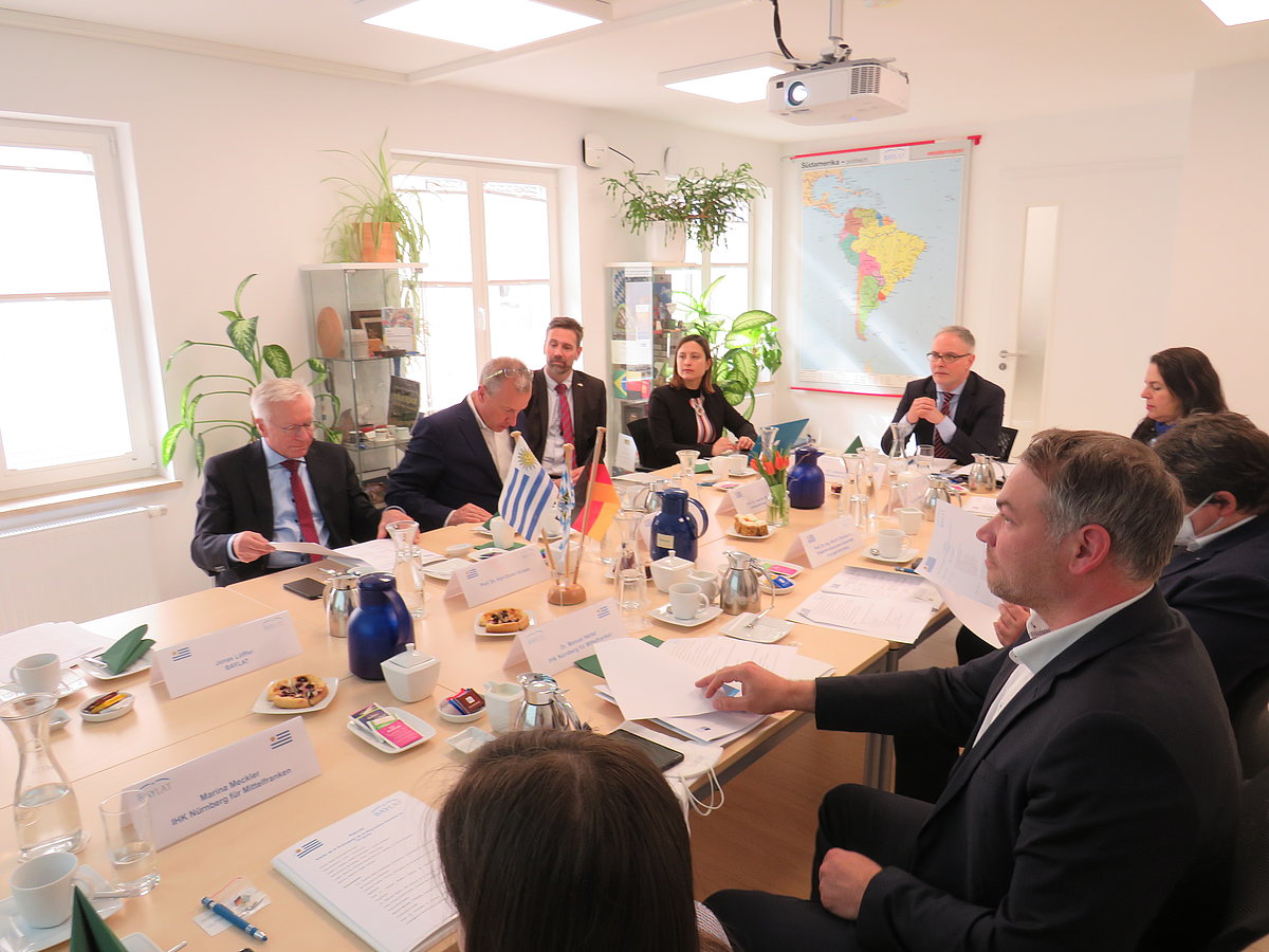 Am Montag, den 25. April 2022, besuchten der Botschafter der Republik Östlich des Uruguay, S.E. Gabriel Bellón Marrapodi und die Konsulin diieser Botschaft, Victoria Codina, Erlangen und das Bayerische Hochschulzentrum für Lateinamerika (BAYLAT). Ziel des Treffens war es, die wissenschaftliche und akademische Zusammenarbeit zwischen Institutionen in Uruguay und Bayern zu fördern und neue Möglichkeiten der wirtschaftlichen Kooperation zu identifizieren. Zu diesem Zweck lud BAYLAT Vertreter aus Wissenschaft und Wirtschaft der Region ein und organisierte einen Besuch bei der Stadt Erlangen.