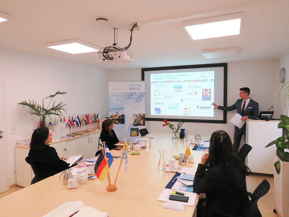 Nach der Begrüßung und der Einführung durch Dr. de Melo-Reiners folgte ein Vortrag von Jonas Löffler in spanischer Sprache für die Gäste. In seiner Präsentation gab er den Besucherinnen Einblicke in die Arbeit von BAYLAT und die verschiedenen Aktivitäten des Hochschulzentrums. Dr. de Melo-Reiners kommentierte die Schilderungen mit ergänzenden Ausführungen und konkreten Vorschlägen für die mögliche Zusammenarbeit.