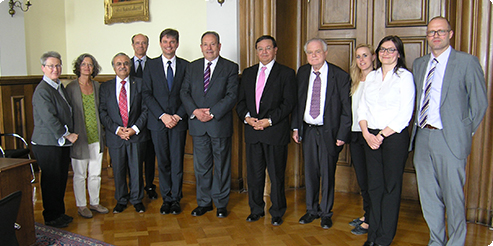 Mittags lud BAYLAT zu einem gemeinsamen Arbeitsessen in Erlangen ein. An diesem Arbeitsessen nahmen weitere RepräsentantInnen der FAU Erlangen-Nürnberg teil: Prof. Dr. Aldo Boccaccini, Lehrstuhl für Werkstoffwissenschaften (Biomaterialien), Dr.-Ing. Anuhar Osorio Nesme, Lehrstuhl für Strömungsmechanik (LSTM) und Prof. Dr. Andrea Pagni, Vorsitzende des BAYLAT-Direktoriums und Professur für Lateinamerikanistik, insbesondere Literatur- und Kulturwissenschaft. Anschließend empfing Prof. Dr. Joachim Hornegger, Präsident der FAU Erlangen-Nürnberg zusammen mit Prof. Dr. Günter Leugering, Vizepräsident für Internationale Angelegenheiten, Dr. Brigitte Perlick, Leiterin des Referats Internationale Angelegenheiten und Dr. Natalia Jörg, Referentin des Vizepräsidenten für Internationales die Delegation. Inhalte des Arbeitstreffens waren die Möglichkeiten einer Intensivierung der Zusammenarbeit zwischen beiden Universitäten in Form von Studierenden- und Wissenschaftleraustausch sowie Summer Schools.