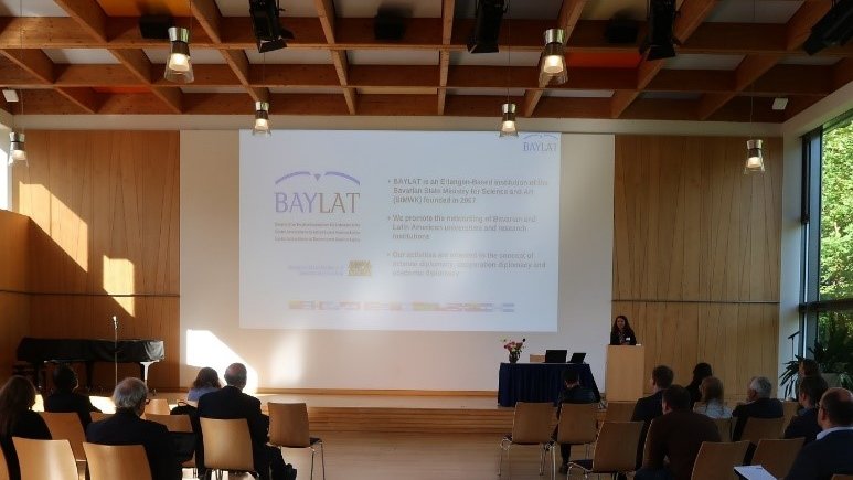 Am Mittwoch, den 21. September hatte BAYLAT die Ehre daran teilzunehmen. Dr. Irma de Melo, Geschäftsführerin von BAYLAT, zusammen mit Polliana Sattler, M. A., Referentin und Förderbeauftragte von BAYLAT, hielten eine Präsentation mit dem Titel „Fördermöglichkeiten für WissenschaftlerInnen und Studierende in Bayern und Lateinamerika“. Dabei wurden die Programme und Aktivitäten von BAYLAT vorgestellt und eine mögliche Erweiterung der geförderten Gruppe besprochen.