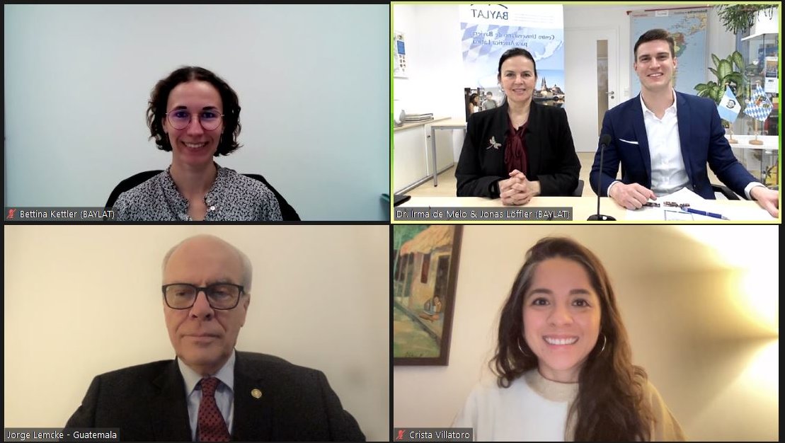 Neben dem Botschafter nahm die guatemaltekische Gesandte-Botschaftsrätin Crista Villatoro Delgado an dem Online-Arbeitstreffen teil. Seitens BAYLAT waren Dr. Irma de Melo-Reiners, BAYLAT-Geschäftsführerin, Jonas Löffler, BAYLAT-Referent und Marketingbeauftragter und Bettina Kettler, BAYLAT-Referentin und Förderbeauftragte, anwesend.