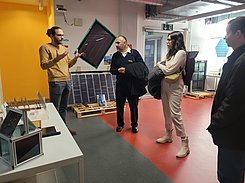 El martes 17 de enero, durante la mañana, la delegación visitó en Núremberg el Energie Campus Nürnberg (EnCN), un centro de investigación que desarrolla nuevas tecnologías para todo el sistema energético, y en el Nuremberg Campus of Technology (NCT) plataforma de investigación técnico-científica de los dos socios colaboradores Friedrich-Alexander-Universität Erlangen-Nürnberg (FAU) y la Technische Hochschule Nürnberg Georg Simon Ohm (THN) por el Sr. Markus Rützel, Director General y el Sr. Karin Zarrabi, Asistente del Director General. Allí, tuvieron la oportunidad de obtener valiosa información sobre el campus en general. La información más específica fue ofrecida mediante presentaciones a cargo del Prof. Dr. rer. nat.Wolfgang Krcmar, Gestor de proyectos de eficiencia, sobre construcción civil con materiales altamente aislantes del calor para obtener energía eficiente en casas inteligentes y del Dr. Andreas Distler, Institute Materials for Electronics and Energy Technology (i.Meet), Cátedra de Ciencia de los Materiales, quién como parte de una visita a la sala de exposiciones de materiales fotovoltaicos, basó su presentación en la energía fotovoltaica orgánica (OPV). Esta es la tecnología fotovoltaica más eficiente y menos contaminante. Posteriormente, fueron invitados al laboratorio de almacenamiento de energía.