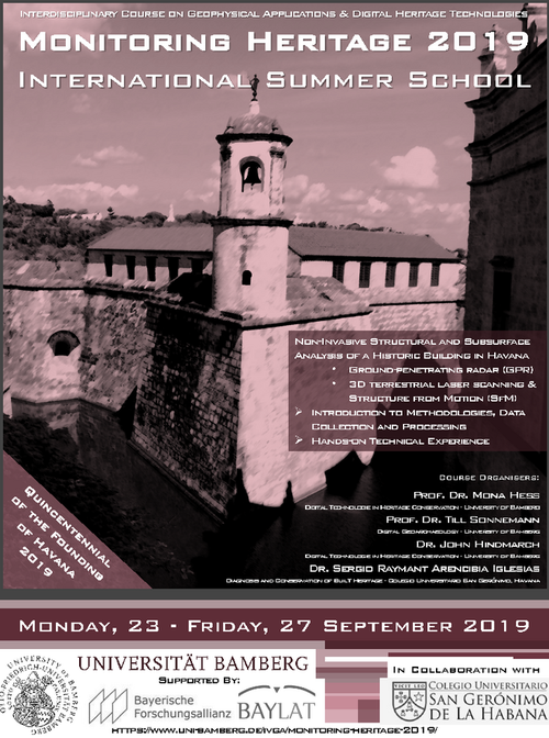 Die Summer School ist ein interdisziplinärer Kurs, der geophysische Anwendungen und digitale Denkmaltechnologien ausgerichtet vom Institut für Archäologische Wissenschaften, Denkmalwissenschaften und Kunstgeschichte der Universität Bamberg. Sie bietet praktische Erfahrungen sowie eine Einführung in die theoretischen Grundlagen der nicht-invasiven Strukturanalyse und der Erfassung historischer Gebäude.